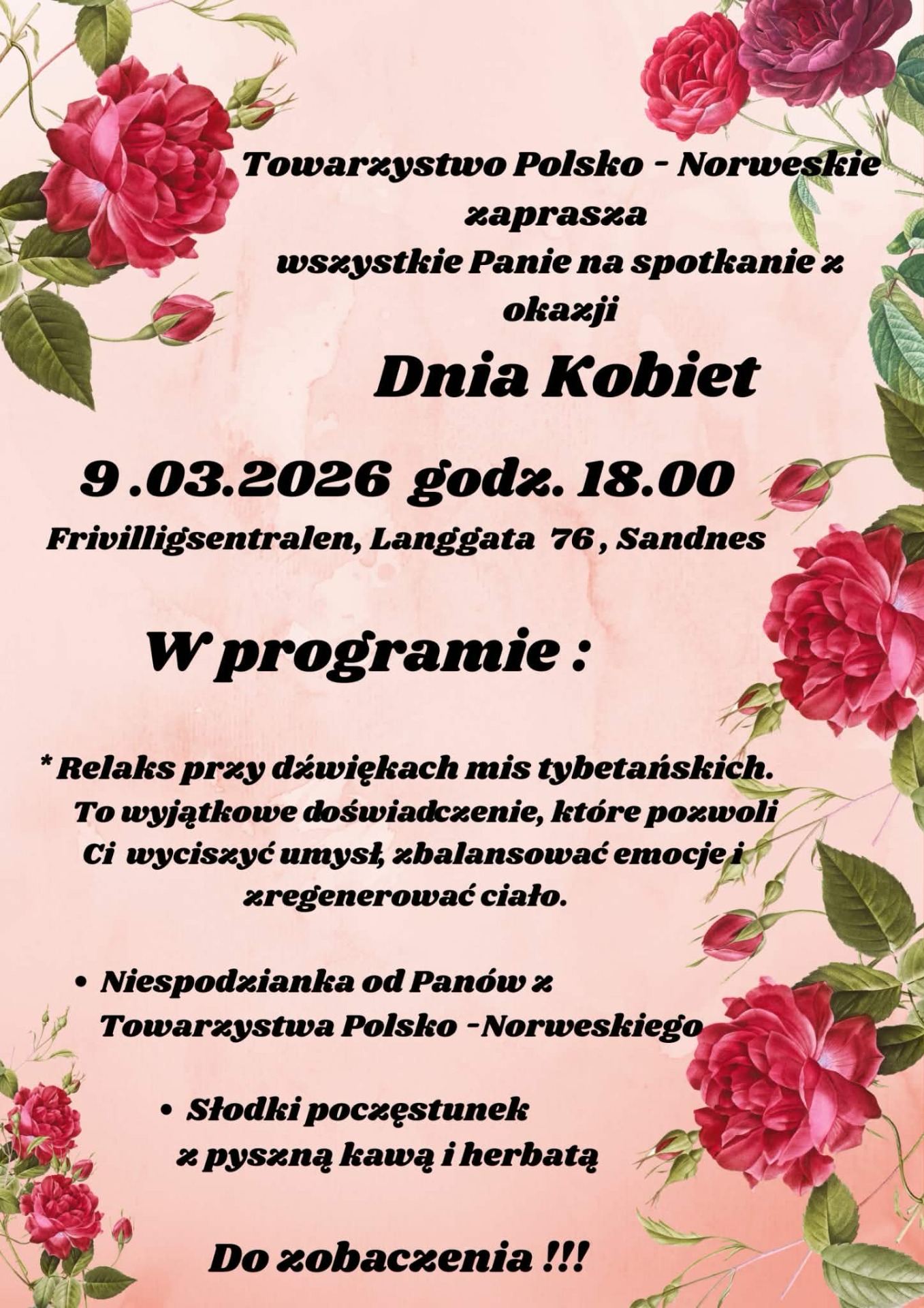 Towarzystwo Polsko-Norweskie w Stavanger serdecznie zaprasza wszystkie Panie na niesamowity Dzień Kobiet który odbędzie się 9 marca w Sandnes.