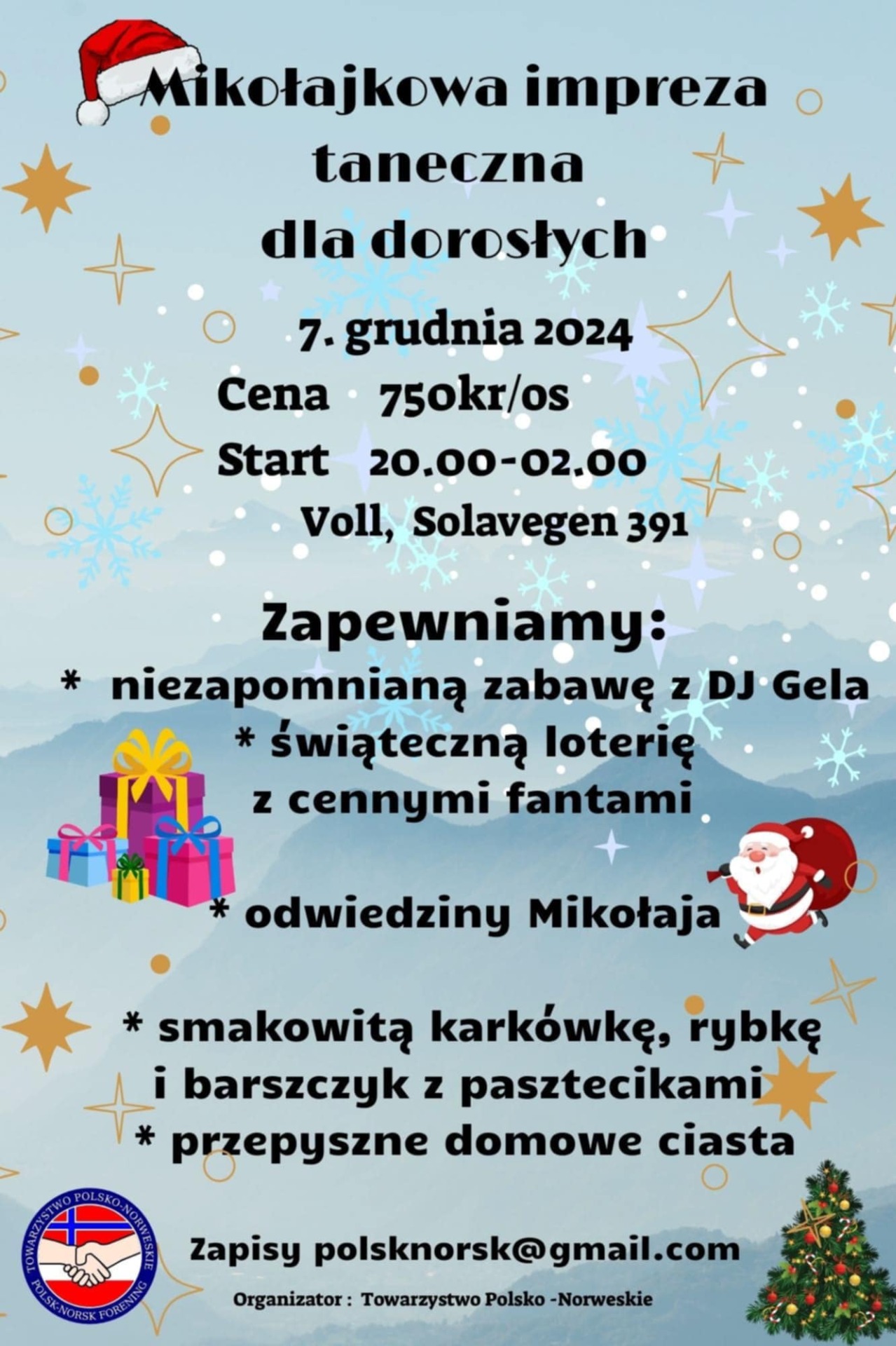 Ho ho ho! Zapraszamy na Mikołajkową imprezę taneczną dla dorosłych! Kto powiedział, że Mikołajki są tylko dla dzieci? My, dorośli, też zasługujemy na odrobinę świątecznej magii, świetną zabawę i trochę relaksu przed świątecznym szaleństwem! Dlatego serdecznie zapraszamy Was na wyjątkową, mikołajkową noc pełną muzyki, tańca i pyszności!